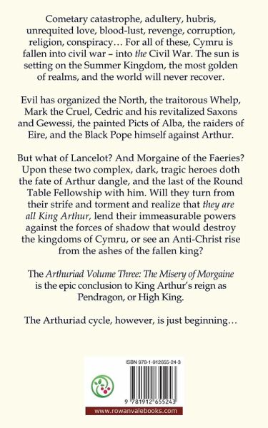 Cometary catastrophe, adultery, hubris, unrequited love, blood-lust, revenge, corruption, religion, conspiracy… For all of these, Cymru is fallen into civil war – into the Civil War. The sun is setting on the Summer Kingdom, the most golden of realms, and the world will never recover. Evil has organized the North, the traitorous Whelp, Mark the Cruel, Cedric and his revitalized Saxons and Gewessi, the painted Picts of Alba, the raiders of Eire, and the Black Pope himself against Arthur. But what of Lancelot? And Morgaine of the Faeries? Upon these two complex, dark, tragic heroes doth the fate of Arthur dangle, and the last of the Round Table Fellowship with him. Will they turn from their strife and torment and realize that they are all King Arthur, lend their immeasurable powers against the forces of shadow that would destroy the kingdoms of Cymru, or see an Anti-Christ rise from the ashes of the fallen king? The Arthuriad Volume Three: The Misery of Morgaine is the epic conclusion to King Arthur's reign as Pendragon, or High King. The Arthuriad cycle, however, is just beginning...
