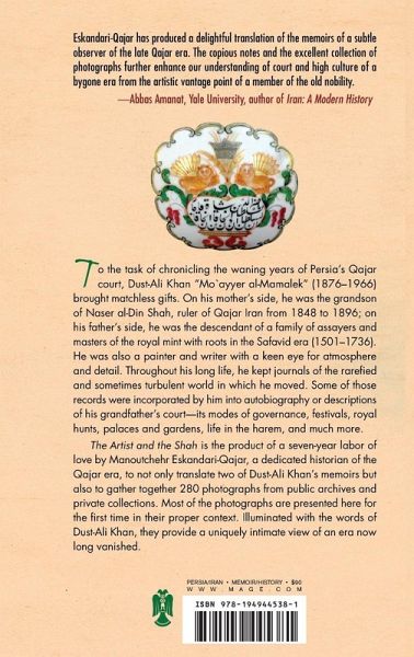 To the task of chronicling the waning years of Persia's Qajar court, Dust-Ali Khan "Mo`ayyer al-Mamalek" (1876-1966) brought matchless gifts. On his mother's side, he was the grandson of Naser al-Din Shah, ruler of Qajar Iran from 1848 to 1896; on his father's side, he was the descendant of a family of assayers and masters of the royal mint with roots in the Safavid era (1501-1736). He was also a painter and writer with a keen eye for atmosphere and detail. Throughout his long life, he kept journals of the rarefied and sometimes turbulent world in which he moved. Some of those records were incorporated by him into autobiography or descriptions of his grandfather's court-its modes of governance, festivals, royal hunts, palaces and gardens, life in the harem, and much more. The Artist and the Shah is the product of a seven-year labor of love by Manoutchehr Eskandari-Qajar, a dedicated historian of the Qajar era, to not only translate two of Dust-Ali Khan's memoirs but also to gather together 280 photographs from public archives and private collections. Most of the photographs are presented here for the first time in their proper context. Illuminated with the words of Dust-Ali Khan, they provide a uniquely intimate view of an era now long vanished.