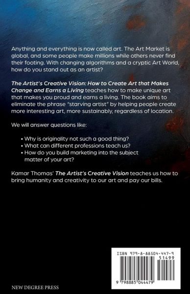 Anything and everything is now called art. The Art Market is global, and some people make millions while others never find their footing. With changing algorithms and a cryptic Art World, how do you stand out as an artist? The Artist's Creative Vision: How to Create Art that Makes Change and Earns a Living teaches how to make unique art that makes you proud and earns a living. The book aims to eliminate the phrase "starving artist" by helping people create more interesting art, more sustainably, regardless of location. We will answer questions like:Why is originality not such a good thing? What can different professions teach us? How do you build marketing into the subject matter of your art? Kamar Thomas' The Artist's Creative Vision teaches us how to bring humanity and creativity to our art and pay our bills.