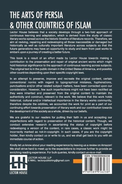 The Arts Of Persia & Other Countries Of Islam This book is a result of an effort made by us towards making a contribution to the preservation and repair of original classic literature. In an attempt to preserve, improve and recreate the original content, we have worked towards: 1. Type-setting & Reformatting: The complete work has been re-designed via professional layout, formatting and type-setting tools to re-create the same edition with rich typography, graphics, high quality images, and table elements, giving our readers the feel of holding a 'fresh and newly' reprinted and/or revised edition, as opposed to other scanned & printed (Optical Character Recognition - OCR) reproductions. 2. Correction of imperfections: As the work was re-created from the scratch, therefore, it was vetted to rectify certain conventional norms with regard to typographical mistakes, hyphenations, punctuations, blurred images, missing content/pages, and/or other related subject matters, upon our consideration. Every attempt was made to rectify the imperfections related to omitted constructs in the original edition via other references. However, a few of such imperfections which could not be rectified due to intentional\unintentional omission of content in the original edition, were inherited and preserved from the original work to maintain the authenticity and construct, relevant to the work. We believe that this work holds historical, cultural and/or intellectual importance in the literary works community, therefore despite the oddities, we accounted the work for print as a part of our continuing effort towards preservation of literary work and our contribution towards the development of the society as a whole, driven by our beliefs. We are grateful to our readers for putting their faith in us and accepting our imperfections with regard to preservation of the historical content. HAPPY READING!