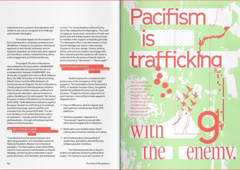 "Resistance requires not only critical thinking, but also new aesthetic approaches. This project addresses this significant challenge." Ilija Trojanow, writer, translator and publisher "I would have loved to take part myself: To learn about historical fascism, to detect and recognise its current forms, and how, despite our different origins and strategies, we fundamentally belong to the same side. These days, the way frontlines are drawn is so unbearably ugly and banal, it seems not just reasonable to develop an art of resistance, it could also be beautiful." Eva Menasse, writer The Arts of Resistance constitutes a collaborative and intergenerational artistic research inquiry into the historical and contemporary (artistic) means of resistance against fascism, initiated by Ruth Anderwald + Leonhard Grond as part of their long-term engagement with the topic.