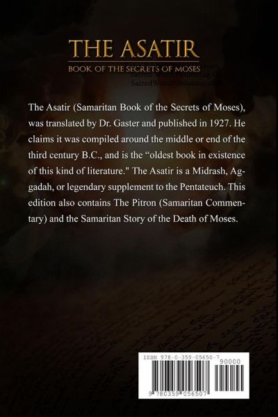 The Asatir (Samaritan Book of the Secrets of Moses), was translated by Dr. Gaster and published in 1927. He claims it was compiled around the middle or end of the third century B.C., and is the "oldest book in existence of this kind of literature." This edition also contains The Pitron (Samaritan Commentary) and the Samaritan Story of the Death of Moses. "The best way to describe the Asatir is to call it a Midrash, Aggadah, or legendary supplement to the Pentateuch. Unlike other Apocrypha with which it has much in common, the author does not attempt to retail anew the sacred history and to present it in a specific form, and with a deliberate tendency. He is content to leave the sacred scripture as it stands, without meddling with its narrative and without trying to readjust the events recounted therein, according to a certain preconceived system either legal or astronomical."