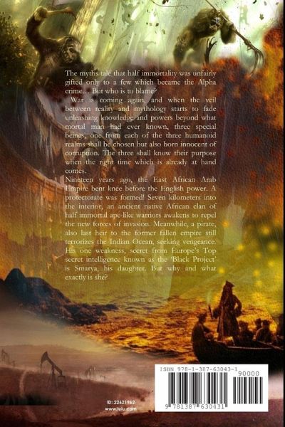 The myths tale that half immortality was unfairly gifted only to a few which became the Alpha crime... But who is to blame? War is coming again, and when the veil between reality and mythology starts to fade unleashing knowledge and powers beyond what mortal man had ever known, three special beings, one from each of the three humanoid realms shall be chosen but also born innocent of corruption. The three shall know their purpose when the right time which is already at hand comes. Nineteen years ago, the East African Arab Empire bent knee before the English power. A protectorate was formed! Seven kilometers into the interior, an ancient native African clan of half immortal ape-like warriors awakens to repel the new forces of invasion. Meanwhile, a pirate, also last heir to the former fallen empire still terrorizes the Indian Ocean, seeking vengeance. His one weakness, secret from Europe's Top secret intelligence known as the 'Black Project' is Smarya, his daughter. But why and what exactly is she?