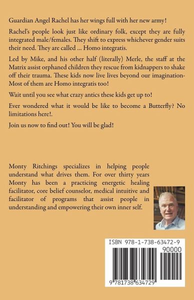 Guardian Angel Rachel has her wings full with her new army. This is a book of possibilities. They look just like the rest of us, except they are fully integrated male/females. As needed, they shift to express whichever gender they need at the time. They are called ... Homo integratis. Led by Mike, and sometimes, his other half (literally) Merle, the staff at the Matrix assist orphaned children they rescue from a notorious kidnapping gang to shake off the trauma of their previous lives and embody the lives they were really born to live- Most of them also Homo integratis too. Wait until you see what crazy antics these kids get up to! These people can do so much more than switch identities instantly. They have evolved past the limitations of regular people. They have learned to truly embrace their truth so now they can do anything the human mind can perceive... teleporting themselves to distant lands, reading minds, healing themselves, becoming butterflies... and that's just the start! Ever wondered what it would be like to live without limitations? Ever wondered what it would be like to be a butterfly?