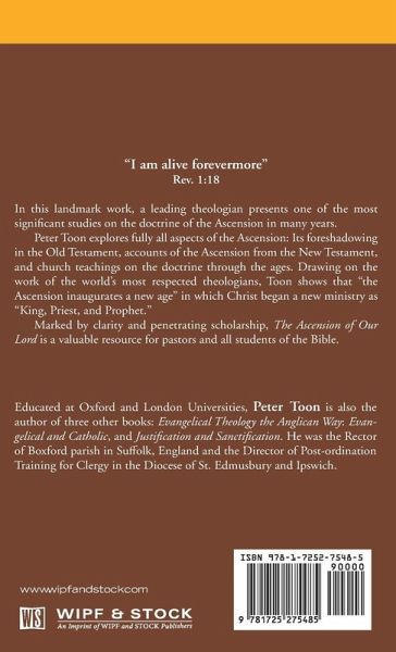 ""I am alive forevermore"" - Rev. 1:18 In this landmark work, a leading theologian presents one of the most significant studies on the doctrine of the Ascension in many years. Peter Toon explores fully all aspects of the Ascension: Its foreshadowing in the Old Testament, accounts of the Ascension from the New Testament, and church teachings on the doctrine through the ages. Drawing on the work of the world's most respected theologians, Toon shows that ""the Ascension inaugurates a new age"" in which Christ began a new ministry as ""King, Priest, and Prophet."" Marked by clarity and penetrating scholarship, The Ascension of Our Lord is a valuable resource for pastors and all students of the Bible.