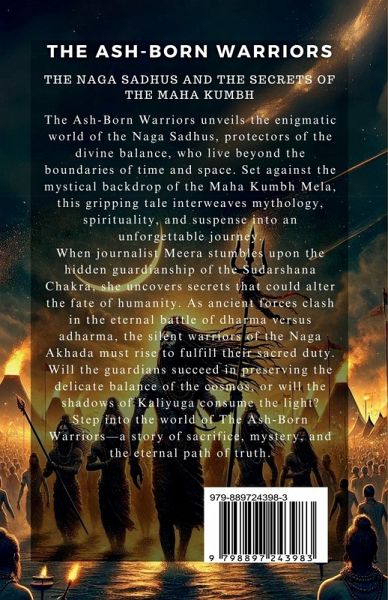 The Ash-Born Warriors unveils the enigmatic world of the Naga Sadhus, protectors of the divine balance, who live beyond the boundaries of time and space. Set against the mystical backdrop of the Maha Kumbh Mela, this gripping tale interweaves mythology, spirituality, and suspense into an unforgettable journey. When journalist Meera stumbles upon the hidden guardianship of the Sudarshana Chakra, she uncovers secrets that could alter the fate of humanity. As ancient forces clash in the eternal battle of dharma versus adharma, the silent warriors of the Naga Akhada must rise to fulfill their sacred duty. Will the guardians succeed in preserving the delicate balance of the cosmos, or will the shadows of Kaliyuga consume the light? Step into the world of The Ash-Born Warriors - a story of sacrifice, mystery, and the eternal path of truth.