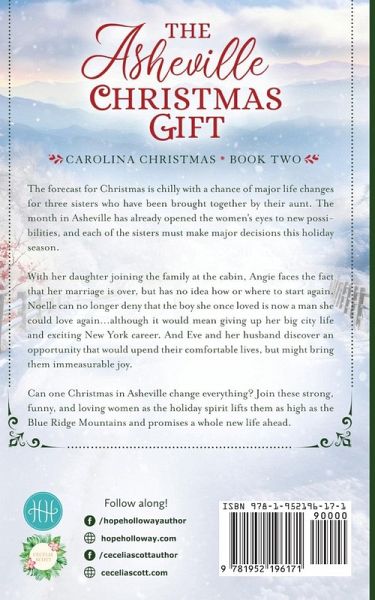 The charming, heartwarming holiday series continues, whisking you away to a dreamy winter in the mountains. With sweet romance, strong family bonds, and an uplifting story of hope and joy, this is the perfect Christmas collaboration between two beloved women's fiction authors! The forecast for Christmas is chilly with a chance of major life changes for three sisters who have been brought together by their aunt. The month in Asheville has already opened the women's eyes to new possibilities, and each of the sisters must make major decisions this holiday season. With her daughter joining the family at the cabin, Angie faces the fact that her marriage is over, but has no idea how or where to start again. Noelle can no longer deny that the boy she once loved is now a man she could love again...although it would mean giving up her big city life and exciting New York career. Eve and her husband discover an opportunity that would upend their comfortable lives, but might bring them immeasurable joy. Can one Christmas in Asheville change everything? Join these strong, funny, and loving women as the holiday spirit lifts them as high as the Blue Ridge Mountains and promises a whole new life ahead. The Carolina Christmas Trilogy The Asheville Christmas Cabin -- book 1 The Asheville Christmas Gift -- book 2 The Asheville Christmas Wedding -- book 3