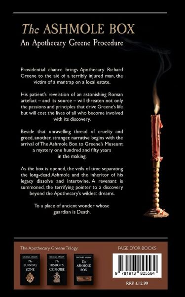 Book 3 of the Apothecary Greene Trilogy Providential chance brings Apothecary Richard Greene to the aid of a terribly injured man, the victim of a mantrap on a local estate. His patient's revelation of an astonishing Roman artefact - and its source - will threaten not only the passions and principles that drive Greene's life but will cost the lives of all who become involved with its discovery. Beside that unravelling thread of cruelty and greed, another, stranger, narrative begins with the arrival of The Ashmole Box to Greene's Museum; a mystery one hundred and fifty years in the making. As the box is opened, the veils of time separating the long-dead Ashmole and the inheritor of his legacy dissolve and intertwine. A revenant is summoned, the terrifying pointer to a discovery beyond the Apothecary's wildest dreams. To a place of ancient wonder whose guardian is Death. www.pagedor.co.uk Praise for The Burning Zone (Volume 1): "...a well-crafted, well-constructed novel ... could do for Lichfield what Cadfael did for Shrewsbury." - Ralph James MBE, The Lichfield Mercury "The interesting balance of fact and fiction make this a great read and a real page turner." - Alison Smith, Express and Star Praise for The Bishop's Grimoire (Volume 2): ""This is one of the most enjoyable and unputdownable books I have read in a long time ... I can't recommend this book enough." - Marilyn Pemberton, Historical Novel Review (Editors' Choice 2022)