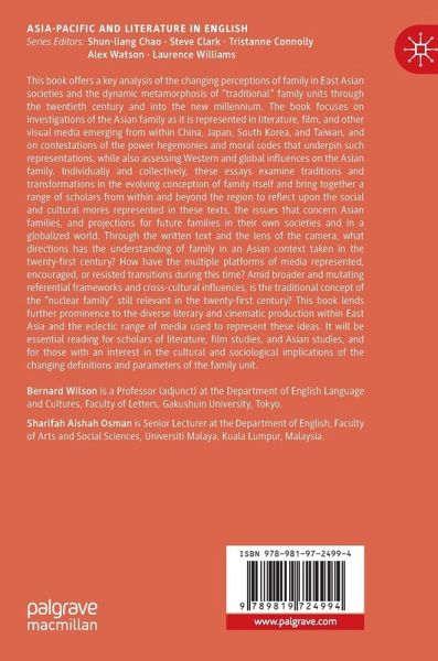 1. Introduction.- 2. Reimagining the Asian Family in the New Millennium: Prevailing Practices, Changing Perceptions.- Part I. Tradition and Traversal.- 3. The Conception of Family in Japanese Law: Its Changes and Continuities,1868-2015.- 4. The Past in the Present: Alternatives to the Confucian Family in South Korea.- 5. Transcending Traditional Notions of Family: A Cinematic Exploration by Hirokazu Kore-eda.- 6. That Which Goes Unsaid: Our Little Sister and Hirokazu Kore-eda's Revision of Yasujiro Ozu's Familial Dynamics.- Part II. Contesting Patriarchy.- 7. A Comparative Study on the Representation of the Confucian Family and the Image of the Father in Ang Lee's Crouching Tiger, Hidden Dragon and Hulk.- 8. The Chinese Family at the Dinner Table: The Father Figure in Ang Lee's Eat Drink Man Woman.- 9. A New Perspective on Taiwanese Motherhood and Domestic Dynamics in Ang Lee's Pushing Hands and Eat Drink Man Woman.- 10. Fear and Paterfamilias in Taiwan Cinema: A Discourse on Identity in The Fourth Portrait (2010).- 11. Failed Fathers, Sacrificial Daughters: Haunting, Fantasy and Redemption in Bong Joon Ho's The Host and Parasite.- 12. Domestic Space and Feminist Practice in Yang Lina's Trilogy of Women.- 13. Dismantling the Family Ideology in Contemporary Japanese Literature: Hatred and Disgust in Three Family Stories by Kakuta Mitsuyo.- Part III. Gender, Sexuality, Identity.- 14. Transforming and Transgressing: The Dilemmatic Transgender Women in Close-Knit and Midnight Swan.- 15. Promising Representations, Positive Role Models: The Awareness and Acceptance of Homosexuality in Contemporary Japanese Manga.- 16. Sex Work, Secrecy and Sisterhood: Jo Keung-ha's The Body Confession and Post-Colonial Family Constructions.- 17. Skinship and the doing of Intimacy: Alternate Forms of Family Making in Suk Suk, Dear Tenant, and Broker.- 18. Dismantling Heteronormativity: Alternative Family Structures in South Korean Cinema.- Part IV. Nation, Narration, Contestation.- 19. Between Oikos and Polis: Compliant Complaint in Zhang Yimou's Curse of the Golden Flower and Coming Home.- 20. Family-Nation Narrative: Representations of the Family Unit in CCTV Spring Festival Gala's Comedy Sketches (1983-2022).- 21. Representations of the Changing Roles of Family in Chinese Children's Books in the Past Four Decades.- 22. The Haunted Family: National Identity Difficulties in Taiwanese Horror Movies (2015-2022).- 23. No Place Like Home: The Human Geography of the Taiwanese Family in the films of Hou Hsiao-hsien and Edward Yang.- 24. Sans Famille: Hong Sang-soo's Landscapes of Loss and Lack.- Part V. Trajectories.- 25. The Changing Images of the Family in the Age of Globalization: Renegotiating Gender Roles and Family Relations in Taiwanese Picturebooks.- 26. Reimagining Bad Kids: The Emergence of Family Crime Drama in the Chinese Digital Streaming Era.- 27. The Nuclear Family in Twenty-First Century Korean Drama.- 28. Representations and Limitations of Korean Coupledom through Korean TV Shows.- 29. Aging Fathers and the Changing Family Dynamic in South Korean Webtoons.