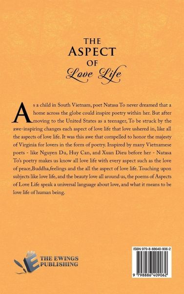 As a child in South Vietnam, poet Natasa To never dreamed that a home across the globe could inspire poetry within her. But after moving to the United States as a teenager, To be struck by the awe-inspiring changes each aspect of love life that love ushered in, like all the aspects of love life. It was this awe that compelled to honor the majesty of Virginia for lovers in the form of poetry. Inspired by many Vietnamese poets - like Nguyen Du, Huy Can, and Xuan Dieu before her - Natasa To's poetry makes us know all love life with every aspect such as the love of peace,Buddha,feelings and the all the aspect of love life. Touching upon subjects like love life, and the beauty love all around us, the poems of Aspects of Love Life speak a universal language about love, and what it means to be love life of human being.