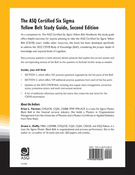 As a companion to The ASQ Certified Six Sigma Yellow Belt Handbook, this study guide offers helpful exercises for anyone planning to take the ASQ Certified Six Sigma Yellow Belt (CSSYB) exam. Unlike other resources, this book has been developed specifically to address the 2022 CSSYB Body of Knowledge (BoK), considering the proper depth of knowledge and required levels of cognition. Every practice question in both sections details solutions that explain the correct answer and the corresponding section of the BoK to the question to facilitate further study as needed. Inside, you will find: • SECTION 1, which offers 161 practice questions organized by the five parts of the BoK • SECTION 2, which offers 139 additional practice questions from each of the five parts • Updates to the 2022 CSSYB BoK, including new supply chain management, corrective action, preventive action, and work instructions sections • A list of additional references used by the teams that create the test items for the CSSYB examination.