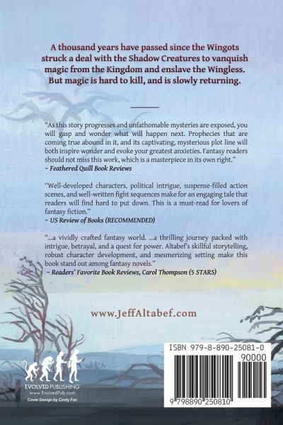 A thousand years have passed since the Wingots struck a deal with the Shadow Creatures to vanquish magic from the Kingdom and enslave the Wingless. But magic is hard to kill, and is slowly returning. Cassara, a young Wingless Magic Shaper and Master Assassin, hates the Wingots and their ability to fly more than anyone. When a Seer glimpses the murder of a Wingot Prince, her uncle tasks her with the unthinkable-to save him. Time is running out. The Shadow Creatures have returned, and they want to rule over the Kingdom. Can Cassara look beyond her hate and see the Wingot Prince for who he is? Why do the Wingots call him the Traitor Prince? And what about a secret Prophecy that foretells her future? Nothing is as it seems. Desperate, Cassara needs an army, she needs magic, and she needs dragons, but is she willing to pay the ultimate price to bring them back? EVOLVED PUBLISHING PRESENTS "A Four Kingdom Fantasy," an epic adventure we hope will be the first of many from Jeff Altabef, the multiple-award-winning author of such critically acclaimed series as "A Nephilim Thriller," "A Point Thriller," "Chosen," and "Red Death." "...a vividly crafted fantasy world. ...a thrilling journey packed with intrigue, betrayal, and a quest for power. Altabef's skillful storytelling, robust character development, and mesmerizing setting make this book stand out among fantasy novels." ~ Readers' Favorite Book Reviews, Carol Thompson (5 STARS) "The Assassin, the Traitor, and the Prophecy is a great read for fantasy fans who love magic, complex characters, and a story that keeps you guessing, and I definitely recommend it." ~ Readers' Favorite Book Reviews, K.C. Finn (5 STARS) "...wonderfully written and takes the reader on a gripping journey filled with unexpected directions and dilemmas that leave one looking forward to the events of subsequent chapters." ~ Readers' Favorite Book Reviews, Frank Mutuma (5 STARS) "Well-developed characters, political intrigue, suspense-filled action scenes, and well-written fight sequences make for an engaging tale that readers will find hard to put down. This is a must-read for lovers of fantasy fiction." ~ US Review of Books (RECOMMENDED) "As this story progresses and unfathomable mysteries are exposed, you will gasp and wonder what will happen next. Prophecies that are coming true abound in it, and its captivating, mysterious plot line will both inspire wonder and evoke your greatest anxieties. Fantasy readers should not miss this work, which is a masterpiece in its own right." ~ Feathered Quill Book Reviews