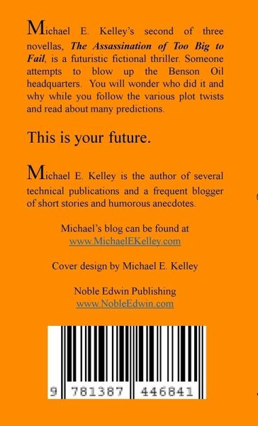 The Assassination of Too Big to Fail, the second of three novellas, is a futuristic fictional thriller. Someone attempts to blow up the Benson Oil headquarters. You will wonder who did it and why while you follow the various plot twists and read about many predictions.