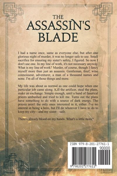 I had a name once, same as everyone else, but after one glorious night of murder it was no longer safe to use. Small sacrifice for ensuring my sister's safety, I figured. So now I don't use one. In my line of work, it's not necessary anyway. What is my line of work? Murder, of course, though I fancy myself more than just an assassin. Gentleman, thief, wine connoisseur, adventurer, a man of a thousand names and none. I'm all of those things and more. My life was about as normal as one could hope when one particular job came along. Kill the artificer, steal the plans, make an exchange. Simple enough, until a band of fanatical priests ambushed and tried to kill me. Turns out the plans have something to do with a source of dark energy. The priests aren't the only ones interested in it, either. I've no interest in being a hero, but I'll do whatever I have to do to keep my city--and my sister--safe. There's already blood on my hands. What's a little more?