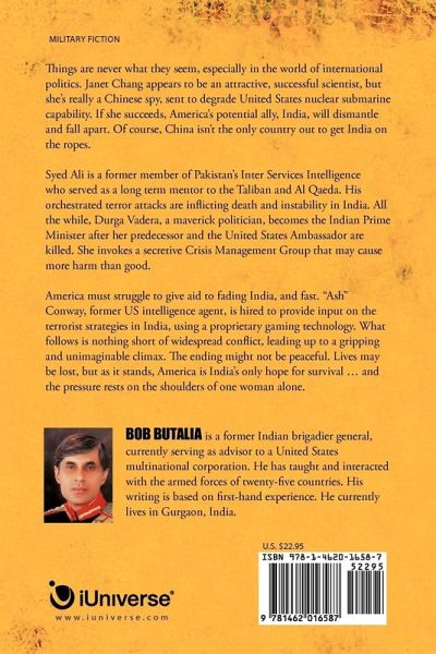 Things are never what they seem, especially in the world of international politics. Janet Chang appears to be an attractive, successful scientist, but she's really a Chinese spy, sent to degrade United States nuclear submarine capability. If she succeeds, America's potential ally, India, will dismantle and fall apart. Of course, China isn't the only country out to get India on the ropes. Syed Ali is a former member of Pakistan's Inter Services Intelligence who served as a long term mentor to the Taliban and Al Qaeda. His orchestrated terror attacks are inflicting death and instability in India. All the while, Durga Vadera, a maverick politician, becomes the Indian Prime Minister after her predecessor and the United States Ambassador are killed. She invokes a secretive Crisis Management Group that may cause more harm than good. America must struggle to give aid to fading India, and fast. "Ash" Conway, former US intelligence agent, is hired to provide input on the terrorist strategies in India, using a proprietary gaming technology. What follows is nothing short of widespread conflict, leading up to a gripping and unimaginable climax. The ending might not be peaceful. Lives may be lost, but as it stands, America is India's only hope for survival ... and the pressure rests on the shoulders of one woman alone.
