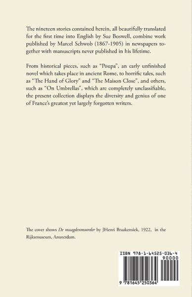 The nineteen stories contained herein, all beautifully translated for the first time into English by Sue Boswell, combine work published by Marcel Schwob (1867-1905) in newspapers together with manuscripts never published in his lifetime. From historical pieces, such as "Poupa", an early unfinished novel which takes place in ancient Rome, to horrific tales, such as "The Hand of Glory" and "The Maison Close", and others, such as "On Umbrellas", which are completely unclassifiable, the present collection displays the diversity and genius of one of France’s greatest yet largely forgotten writers.
