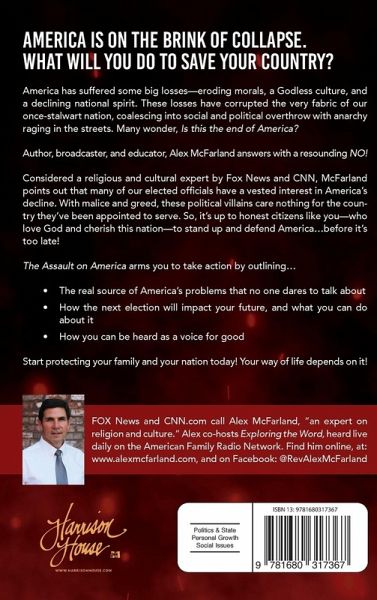 America is on the brink of collapse. What will you do to save your country? America has suffered some big losses—eroding morals, a Godless culture, and a declining national spirit. These losses have corrupted the very fabric of our once-stalwart nation, coalescing into social and political overthrow with anarchy raging in the streets. Many wonder, Is this the end of America? Author, broadcaster, and educator, Alex McFarland answers with a resounding NO! Considered a religious and cultural expert by Fox News and CNN, McFarland points out that many of our elected officials have a vested interest in America’s decline. With malice and greed, these political villains care nothing for the country they’ve been appointed to serve. So, it’s up to honest citizens like you—who love God and cherish this nation—to stand up and defend America…before it’s too late! The Assault on America arms you to take action by outlining… The real source of America’s problems that no one dares to talk about How the next election will impact your future, and what you can do about it How you can be heard as a voice for good Start protecting your family and your nation today! Your way of life depends on it!