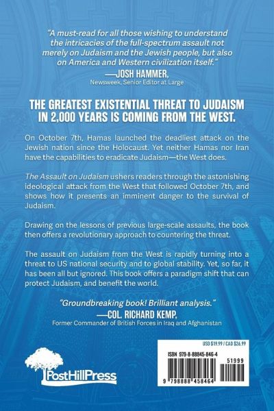 "A must-read for all those wishing to understand the intricacies of the full-spectrum assault not merely on Judaism and the Jewish people, but also on America and Western civilization itself." -JOSH HAMMER, Newsweek, Senior Editor at Large THE GREATEST EXISTENTIAL THREAT TO JUDAISM IN 2,000 YEARS IS COMING FROM THE WEST On October 7th, Hamas launched the deadliest attack on the Jewish nation since the Holocaust. Yet neither Hamas nor Iran have the capabilities to eradicate Judaism-the West does. The Assault on Judaism ushers readers through the astonishing ideological attack from the West that followed October 7th, and shows how it presents an imminent danger to the survival of Judaism. Drawing on the lessons of previous large-scale assaults, the book then offers a revolutionary approach to countering the threat. The assault on Judaism from the West is rapidly turning into a threat to US national security and to global stability. Yet, so far, it has been all but ignored. This book offers a paradigm shift that can protect Judaism, and benefit the world. "Groundbreaking book! Brilliant analysis of the existential threat to Judaism and danger to global stability that followed October 7th. This is the original thinking the world needs to address our era's geopolitical challenges." -COL. RICHARD KEMP, Former Commander of British Forces in Iraq and Afghanistan