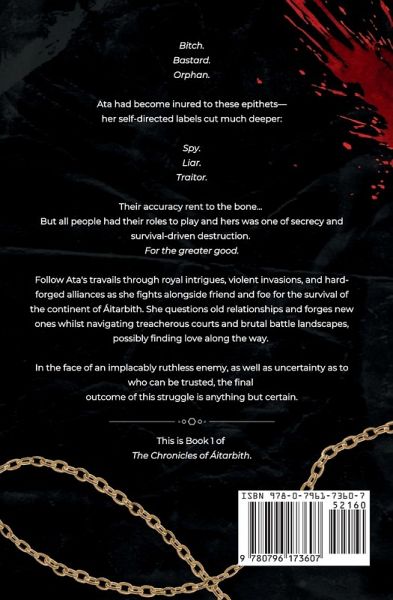 Bitch. Bastard. Orphan. Ata had become inured to these epithets - her self-directed labels cut much deeper: Spy. Liar. Traitor. Their accuracy rent to the bone... But all people had their roles to play and hers was one of secrecy and survival-driven destruction.For the greater good. Follow Ata's travails through royal intrigues, violent invasions, and hard-forged alliances as she fights alongside friend and foe for the survival of the continent of Áitarbith. She questions old relationships and forges new ones whilst navigating treacherous courts and brutal battle landscapes, possibly finding love along the way. In the face of an implacably ruthless enemy, as well as uncertainty as to who can be trusted, the final outcome of this struggle is anything but certain. This is Book 1 of a trilogy titled The Chronicles of Áitarbith.