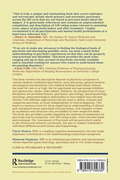 Part I: What is Psychosis? McCarthy-Jones History of Concepts about Psychosis. Parnas Psychosis from a Philosophical/Phenomenological Perspective. Jardri Psychosis and the Brain. Jansson Near Psychosis. Part II: Assessment of Psychosis in Different Populations Castle How to Assess Psychosis: A Practical Guide. Lockey Assessing Psychosis in Forensic Settings. Laroi Psychotic-Like Experiences in Non-Clinical Populations. Sommer Psychosis in Psychiatric Disorders. Schulz Psychosis in the Prodrome. Kelleher Psychosis in Children and Adolescents. Starkstein Psychosis in Medical and Neurological Conditions. Ford Older Adults and Dementia Populations. Part III: Assessment of Psychotic Symptoms Stephane Auditory Hallucinations. Langdon Waters Hallucinations: Visual Olfactory and Tactile. Peters Delusions. Shad Language (Formal Thought) Disorder. Amador Insight. Parnas Disturbance of the Experience of Self (Introspection-Based Assessment). Waters First Rank Symptoms.