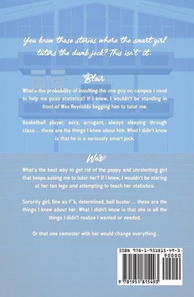You know those stories where the smart girl tutors the dumb jock? This isn't it. Blair What's the probability of insulting the one guy on campus I need to help me pass statistics? If I knew, I wouldn't be standing in front of Wes Reynolds begging him to tutor me. Basketball player, sexy, arrogant, always sleeping through class... these are the things I knew about him. What I didn't know is that he is a seriously smart jock. Wes What's the best way to get rid of the peppy and unrelenting girl that keeps asking me to tutor her? If I knew, I wouldn't be staring at her tan legs and attempting to teach her statistics. Sorority girl, fine as f**k, determined, ball buster... these are the things I knew about her. What I didn't know is that she is all the things I didn't realize I wanted or needed. Or that one semester with her would change everything.