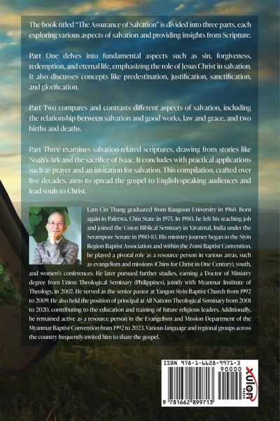 The book titled "The Assurance of Salvation" is divided into three parts, each exploring various aspects of salvation and providing insights from Scripture. Part One delves into fundamental aspects such as sin, forgiveness, redemption, and eternal life, emphasizing the role of Jesus Christ in salvation. It also discusses concepts like predestination, justification, sanctification, and glorification. Part Two compares and contrasts different aspects of salvation, including the relationship between salvation and good works, law and grace, and two births and deaths. Part Three examines salvation-related scriptures, drawing from stories like Noah's Ark and the sacrifice of Isaac. It concludes with practical applications such as prayer and an invitation for salvation. This compilation, crafted over five decades, aims to spread the gospel to English-speaking audiences and lead souls to Christ. Lam Cin Thang graduated from Rangoon University in 1968. Born again in Paletwa, Chin State in 1975. In 1980, he left his teaching job and joined the Union Biblical Seminary in Yavatmal, India under the Serampore Senate in 1980-83. His ministry journey began in the Siyin Region Baptist Association and within the Zomi Baptist Convention, he played a pivotal role as a resource person in various areas, such as evangelism and missions (Chins for Christ in One Century), youth, and women's conferences. He later pursued further studies, earning a Doctor of Ministry degree from Union Theological Seminary (Philippines), jointly with Myanmar Institute of Theology, in 2007. He served as the senior pastor at Yangon Siyin Baptist Church from 1992 to 2009. He also held the position of principal at All Nations Theological Seminary from 2001 to 2020, contributing to the education and training of future religious leaders. Additionally, he remained active as a resource person in the Evangelism and Mission Department of the Myanmar Baptist Convention from 1992 to 2023. Various language and regional groups across the country frequently invited him to share the gospel.