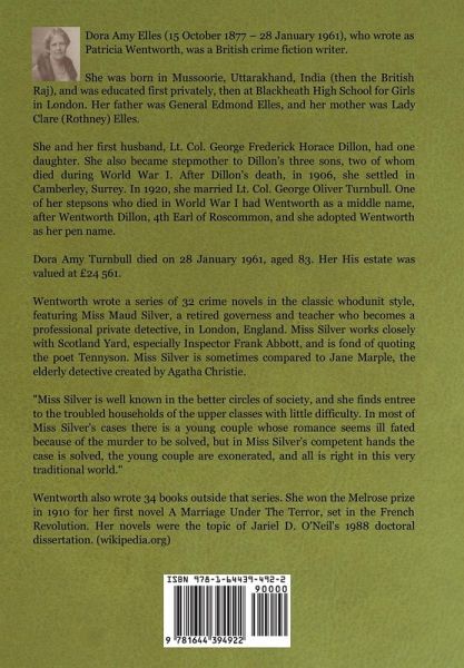 Dora Amy Elles (15 October 1877 - 28 January 1961), who wrote as Patricia Wentworth, was a British crime fiction writer. She was born in Mussoorie, Uttarakhand, India (then the British Raj), and was educated first privately, then at Blackheath High School for Girls in London. Her father was General Edmond Elles, and her mother was Lady Clare (Rothney) Elles. She and her first husband, Lt. Col. George Frederick Horace Dillon, had one daughter. She also became stepmother to Dillon's three sons, two of whom died during World War I. After Dillon's death, in 1906, she settled in Camberley, Surrey. In 1920, she married Lt. Col. George Oliver Turnbull. One of her stepsons who died in World War I had Wentworth as a middle name, after Wentworth Dillon, 4th Earl of Roscommon, and she adopted Wentworth as her pen name. Dora Amy Turnbull died on 28 January 1961, aged 83. Her His estate was valued at £24 561. Wentworth wrote a series of 32 crime novels in the classic whodunit style, featuring Miss Maud Silver, a retired governess and teacher who becomes a professional private detective, in London, England. Miss Silver works closely with Scotland Yard, especially Inspector Frank Abbott, and is fond of quoting the poet Tennyson. Miss Silver is sometimes compared to Jane Marple, the elderly detective created by Agatha Christie. "Miss Silver is well known in the better circles of society, and she finds entree to the troubled households of the upper classes with little difficulty. In most of Miss Silver's cases there is a young couple whose romance seems ill fated because of the murder to be solved, but in Miss Silver's competent hands the case is solved, the young couple are exonerated, and all is right in this very traditional world." Wentworth also wrote 34 books outside that series. She won the Melrose prize in 1910 for her first novel A Marriage Under The Terror, set in the French Revolution. Her novels were the topic of Jariel D. O'Neil's 1988 doctoral dissertation. (wikipedia.org)