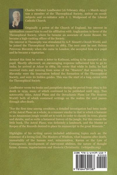Charles Webster Leadbeater (16 February 1854 - 1 March 1934) was a member of the Theosophical Society, author on occult subjects and co-initiator with J. I. Wedgwood of the Liberal Catholic Church. Originally a priest of the Church of England, his interest in spiritualism caused him to end his affiliation with Anglicanism in favor of the Theosophical Society, where he became an associate of Annie Besant. He became a high-ranking officer of the Society. His interest in Theosophy was stimulated by A.P. Sinnett's Occult World, and he joined the Theosophical Society in 1883. The next year he met Helena Petrovna Blavatsky when she came to London; she accepted him as a pupil and he became a vegetarian. Around this time he wrote a letter to Kuthumi, asking to be accepted as his pupil. Shortly afterward, an encouraging response influenced him to go to India; he arrived at Adyar in 1884. He wrote that while in India, he had received visits and training from some of the "Masters" that according to Blavatsky were the inspiration behind the formation of the Theosophical Society, and were its hidden guides. This was the start of a long career with the Theosophical Society. Leadbeater wrote 69 books and pamphlets during the period from 1895 to his death in 1934, many of which continued to be published until 1955. Two noteworthy titles, Astral Plane and the Devachanic Plane (or The Heaven World) both of which contained writings on the realms the soul passes through after death. "For the first time among occultists, a detailed investigation had been made of the Astral Plane as a whole, in a manner similar to that in which a botanist in an Amazonian jungle would set to work in order to classify its trees, plants and shrubs, and so write a botanical history of the jungle. For this reason the little book, The Astral Plane, was definitely a landmark, and the Master as Keeper of the Records desired to place its manuscript in the great Museum." Highlights of his writing career included addressing topics such as: the existence of a loving God, The Masters of Wisdom, what happens after death, immortality of the human soul, reincarnation, Karma or the Law of Consequence, development of clairvoyant abilities, the nature of thought forms, dreams, vegetarianism, Esoteric Christianity He also became one of the best known speakers of the Theosophical Society for a number of years and served as Secretary of the London Lodge. (wikipedia.org)