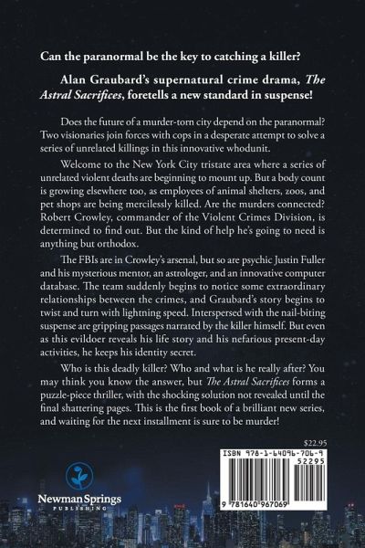 Can the paranormal be the key to catching a killer? Alan Graubard’s supernatural crime drama, The Astral Sacrifices, foretells a new standard in suspense! Does the future of a murder-torn city depend on the paranormal? Two visionaries join forces with cops in a desperate attempt to solve a series of unrelated killings in this innovative whodunit. Welcome to the New York City tristate area where a series of unrelated violent deaths are beginning to mount up. But a body count is growing elsewhere too, as employees of animal shelters, zoos, and pet shops are being mercilessly killed. Are the murders connected? Robert Crowley, commander of the Violent Crimes Division, is determined to find out. But the kind of help he’s going to need is anything but orthodox. The FBIs are in Crowley’s arsenal, but so are psychic Justin Fuller and his mysterious mentor, an astrologer, and an innovative computer database. The team suddenly begins to notice some extraordinary relationships between the crimes, and Graubard’s story begins to twist and turn with lightning speed. Interspersed with the nail-biting suspense are gripping passages narrated by the killer himself. But even as this evildoer reveals his life story and his nefarious present-day activities, he keeps his identity secret. Who is this deadly killer? Who and what is he really after? You may think you know the answer, but The Astral Sacrifices forms a puzzle-piece thriller, with the shocking solution not revealed until the final shattering pages. This is the first book of a brilliant new series, and waiting for the next installment is sure to be murder!