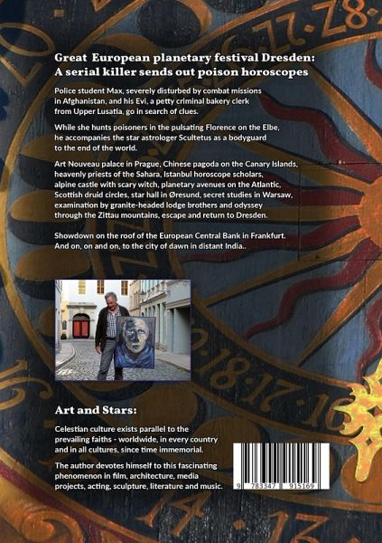 Great European planetary festival in Dresden: a serial killer sends out poison horoscopes.Police student Max, severely disturbed by combat missions in Afghanistan, and his Evi, a petty criminal bakery clerk from Upper Lusatia, go in search of clues. While she hunts poisoners in the pulsating Florence on the Elbe, he accompanies the star astrologer Scultetus as a bodyguard to the end of the world.Art Nouveau palace in Prague, Chinese pagoda on the Canary Islands, heavenly priests of the Sahara, Istanbul horoscope scholars, alpine castle with scary witch, planetary avenues on the Atlantic, Scottish druid circles, star hall in Øresund, secret studies in Warsaw, examination by granite-headed lodge brothers and odyssey through the Zittau mountains, escape and return to Dresden.Showdown on the roof of the European Central Bank in Frankfurt am Main. And on, on and on, to the city of dawn in distant India.