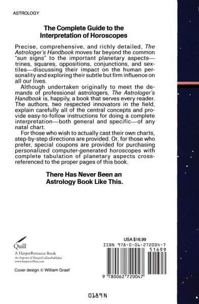 The Complete Guide to the Interpretation of Horoscopes Precise, comprehensive, and richly detailed, The Astrologer's Handbook moves far beyond the common 11 sun signs to the important planetary aspects--trines, squares, oppositions, conjunctions, and sextiles--discussing their impact on the human personality and exploring their subtle but firm influence on all our lives. Although undertaken originally to meet the demands of professional astrologers, The Astrologer's Handbook is, happily, a book that serves every reader. The authors, two respected innovators in the field, explain carefully all of the central concepts and provide easy-to-follow instructions for doing a complete interpretation--both general and specific--of any natal chart. For those who wish to actually cast their own charts, step-by-step directions are provided. Or, for those who prefer, special coupons are provided for purchasing personalized computer-gene rated horoscopes with complete tabulation of planetary aspects cross-referenced to the proper pages of this book.