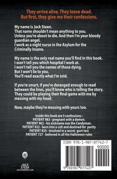 They arrive alive. They always leave dead. But first, they give me their confessions. My name is Jack Steen, and for those who arrive on my 'death' ward at the Asylum, I'm the last face many will see before they die. I am the night nurse at an Asylum for the Criminally Insane, and most of my patients know me as their Angel of Death. I know them as mass murderers, rapists, and serial killers - among other things. Here's what happens: they come on my floor, they give me their deathbed confession, and I help to make their death less painful. There's a catch, though: I want the real story, the one they haven't told anyone else. The majority of these killers are expert manipulators. They could be playing their final game with me by messing with my head. Now, maybe they're messing with yours too. Inside this book are 5 confessions:One thought she gave birth to the antichrist. One has the nickname of The Candyman - any guesses why? One grew up in a cult and believes he's the first of a 'pure' race. Another was part of a secret test by the government, and I've been waiting on his confession for a while! Then there's this kid who loved Halloween and believed in all the rules. I sure hope you didn't break any... WARNING: There is swearing in this book. And some stories might be a trigger for something you have a hard time handling. But, these are the confessions of serial killers, mass murderers, and such, so what do you expect?