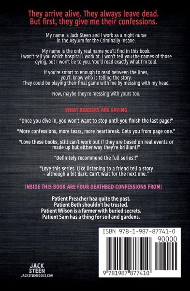 They arrive alive. They always leave dead. But first, they give me their confessions. My name is Jack Steen, and for those who arrive on my 'death' ward at the Asylum, I'm the last face many will see before they die. I am the night nurse at an Asylum for the Criminally Insane, and most of my patients know me as their Angel of Death. I know them as mass murderers, rapists, and serial killers - among other things. Here's what happens: they come on my floor, they give me their deathbed confession, and I help to make their death less painful. There's a catch, though: I want the real story, the one they haven't told anyone else. The majority of these killers are expert manipulators. They could be playing their final game with me by messing with my head. Now, maybe they're messing with yours too. Inside this book are 4 confessions that relate to marriage and murder (and how they go hand in hand): THE PREACHER has quite the past. BETH shouldn't be trusted. WILSON is a farmer with buried secrets. SAM has a thing for soil and gardens. WARNING: There is swearing in this book. And some stories might be a trigger for something you have a hard time handling. But, these are the confessions of serial killers, mass murderers, and such, so what do you expect?