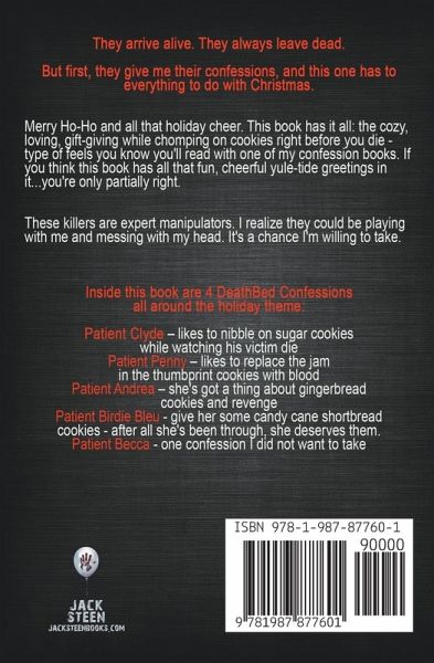 **BONUS CONTENT AVAILABLE IN PRINT BOOK ONLY** They arrive alive. They always leave dead. But first, they give me their confessions, and this one has to everything to do with Christmas. Merry Ho-Ho and all that holiday cheer. This book has it all: the cozy, loving, gift-giving while chomping on cookies right before you die - type of feels you know you'll read with one of my confession books. If you think this book has all that fun, cheerful yule-tide greetings in it...you're only partially right. You know by now my name is Jack Steen, and for those who arrive on my 'death' ward at the Asylum, I'm the last face many will see before they die. I am the night nurse at an Asylum for the Criminally Insane, and most of my patients know me as their Angel of Death. I know them as mass murderers, rapists, and serial killers - among other things. Here's what happens: they come on my floor, they give me their deathbed confession, and I help to make their death less painful. There's a catch, though: I want the real story, the one they haven't told anyone else. These killers are expert manipulators. I realize they could be playing with me and messing with my head. It's a chance I'm willing to take. And now...they might just be playing with yours too. Inside this book are 4 DeathBed Confessions all around the holiday theme:Patient Clyde - likes to nibble on sugar cookies while watching his victim die Patient Penny - likes to replace the jam in the thumbprint cookies with blood Patient Andrea - she's got a thing about gingerbread cookies and revenge Patient Birdie Bleu - give her some candy cane shortbread cookies - after all she's been through, she deserves them. Patient Becca - this was one confession I had no interest in taking but I had no choice. WARNING: There is swearing in this book. And some stories might be a trigger for something you have a hard time handling. But, these ARE the confessions of serial killers, mass murderers, and such, so what do you expect? Because it's the holidays ... my Christmas gift to you will be sharing my favorite anti-Christmas playlist as well as recipes for each of the above cookies mentioned (recipes provided by my mother, who happens to be the best cook and baker in my world).