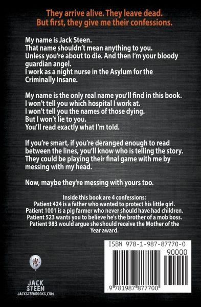 They arrive alive. They always leave dead. But first, they give me their confessions. My name is Jack Steen, and for those who arrive on my 'death' ward at the Asylum, I'm the last face many will see before they die. I am the night nurse at an Asylum for the Criminally Insane, and most of my patients know me as their Angel of Death. I know them as mass murderers, rapists, and serial killers - among other things. Here's what happens: they come on my floor, they give me their deathbed confession, and I help to make their death less painful. There's a catch, though: I want the real story, the one they haven't told anyone else. The majority of these killers are expert manipulators. They could be playing their final game with me by messing with my head. Now, maybe they're messing with yours too. Inside this book are 4 confessions: Patient 424 is a father who wanted to protect his little girl. Patient 1001 is a pig farmer who never should have had children. Patient 523 wants you to believe he's the brother of a mob boss. Patient 983 would argue she should receive the Mother of the Year award. WARNING: There is swearing in this book. And some stories might be a trigger for something you have a hard time handling. But, these are the confessions of serial killers, mass murderers, and such, so what do you expect?