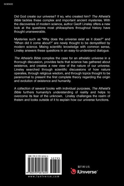 Did God create our universe? If so, who created him? The Atheist's Bible tackles these complex and important ancient mysteries. With the discoveries of modern science, author Geoff Linsley offers a new look at the questions most philosophers throughout history have thought unanswerable. Mysteries such as "Why does the universe exist as it does?" and "When did it come about?" are newly thought to be demystified by modern science. Mixing scientific knowledge with common sense, Linsley answers these questions in an easy-to-understand dialogue. The Atheist's Bible compiles the case for an atheistic universe in a thorough discussion, provides facts that science has gathered about existence, and creates a new view of the nature of our universe. Linsley searched through scientific discussions of how nature operates, through religious wisdom, and through topics thought to be paranormal to present the first complete theory regarding the origin and evolution of existence and humanity. A collection of several books with individual purposes, The Atheist's Bible furthers humanity's understanding of reality and helps to overcome its fear of the unknown. Linsley challenges the realm of theism and looks outside of it to explain how our universe functions.
