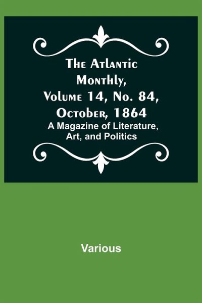 The book "" The Atlantic Monthly, Volume 14, No. 84, October, 1864; A Magazine of Literature, Art, and Politics "" has been considered important throughout the human history, and so that this work is never forgotten we have made efforts in its preservation by republishing this book in a modern format for present and future generations. This whole book has been reformatted, retyped and designed. These books are not made of scanned copies and hence the text is clear and readable.