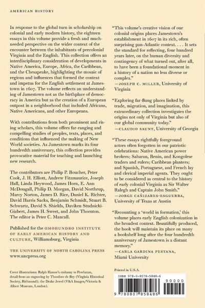 In response to the global turn in scholarship on colonial and early modern history, the eighteen essays in this volume provide a fresh and much-needed perspective on the wider context of the encounter between the inhabitants of precolonial Virginia and the English. This collection offers an interdisciplinary consideration of developments in Native America, Europe, Africa, the Caribbean, and the Chesapeake, highlighting the mosaic of regions and influences that formed the context and impetus for the English settlement at Jamestown in 1607. The volume reflects an understanding of Jamestown not as the birthplace of democracy in America but as the creation of a European outpost in a neighborhood that included Africans, Native Americans, and other Europeans. With contributions from both prominent and rising scholars, this volume offers far-ranging and compelling studies of peoples, texts, places, and conditions that influenced the making of New World societies. As Jamestown marks its four-hundredth anniversary, this collection provides provocative material for teaching and launching new research. Contributors: Philip P. Boucher, University of Alabama, Huntsville Peter Cook, Nipissing University J. H. Elliott, University of Oxford Andrew Fitzmaurice, University of Sydney Joseph Hall, Bates College Linda Heywood, Boston University James Horn, Colonial Williamsburg Foundation E. Ann McDougall, University of Alberta Peter C. Mancall, University of Southern California Philip D. Morgan, Johns Hopkins University David Northrup, Boston College Marcy Norton, The George Washington University James D. Rice, State University of New York, Plattsburgh Daniel K. Richter, University of Pennsylvania David Harris Sacks, Reed College Benjamin Schmidt, University of Washington Stuart B. Schwartz, Yale University David S. Shields, University of South Carolina Daviken Studnicki-Gizbert, McGill University James H. Sweet, University of Wisconsin, Madison John Thornton, Boston University