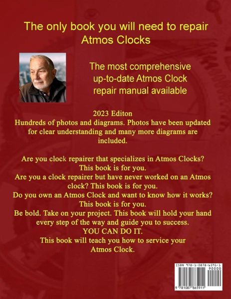 The most comprehensive Atmos Clock Repair Manual. 2023 edition, 300 pages, Hundreds of photos and diagrams. The photos have been updated for clear understanding, and many more diagrams are included. This clock is "perpetual motion". Are you a clock repairer that specializes in Atmos Clocks? This book is for you. Are you a clock repairer but have never worked on an Atmos clock? This book is for you. Do you own an Atmos Clock and want to know how it works? This book is for you. Be bold. Take on your project. This book will hold your hand every step of the way and guide you to success. YOU CAN DO IT. Why does an Atmos Clock Stop Working? Often, the works are dirty and need servicing. The bellows might need charging. The spring might be overwound and needs resetting. This book will teach you how to do all this.