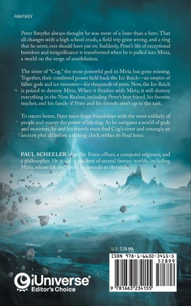 Peter Smythe always thought he was more of a loser than a hero. That all changes with a high school crush, a field trip gone wrong, and a ring that he never, ever should have put on. Suddenly, Peter's life of exceptional boredom and insignificance is transformed when he is pulled into Miria, a world on the verge of annihilation. The sister of "Cog," the most powerful god in Miria has gone missing. Together, their combined power held back the Ice Reich-an empire of fallen gods and ice monsters-for thousands of years. Now, the Ice Reich is poised to destroy Miria. When it finishes with Miria, it will destroy everything in the Nine Realms, including Peter's best friend, his favorite teacher, and his family if Peter and his friends aren't up to the task. To return home, Peter must forge friendships with the most unlikely of people and master the power of his ring. As he navigates a world of gods and monsters, he and his friends must find Cog's sister and untangle an ancient plot all before a ticking clock strikes its final hour.