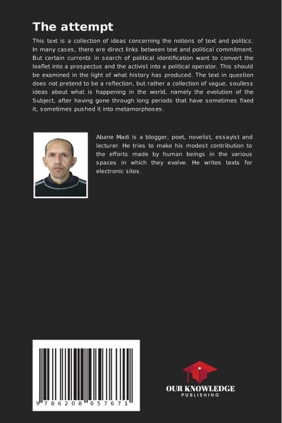 This text is a collection of ideas concerning the notions of text and politics. In many cases, there are direct links between text and political commitment. But certain currents in search of political identification want to convert the leaflet into a prospectus and the activist into a political operator. This should be examined in the light of what history has produced. The text in question does not pretend to be a reflection, but rather a collection of vague, soulless ideas about what is happening in the world, namely the evolution of the Subject, after having gone through long periods that have sometimes fixed it, sometimes pushed it into metamorphoses.