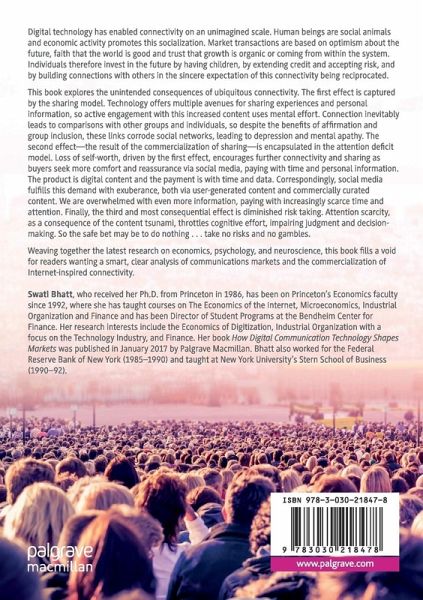 This book explores the unintended consequences of ubiquitous connectivity. The first effect is captured by the sharing model. Technology offers multiple avenues for sharing experiences and personal information, so active engagement with this increased content uses mental effort. Connection inevitably leads to comparisons with other groups and individuals, so despite the benefits of affirmation and group inclusion, these links corrode social networks, leading to depression and mental apathy. The second effect--the result of the commercialization of sharing--is encapsulated in the attention deficit model. Loss of self-worth, driven by the first effect, encourages further connectivity and sharing as buyers seek more comfort and reassurance via social media, paying with time and personal information. The product is digital content and the payment is with time and data. Correspondingly, social media fulfills this demand with exuberance, both via user-generated content and commercially curated content. We are overwhelmed with even more information, paying with increasingly scarce time and attention. Finally, the third and most consequential effect is diminished risk taking. Attention scarcity, as a consequence of the content tsunami, throttles cognitive effort, impairing judgment and decision-making. So the safe bet may be to do nothing . . . take no risks and no gambles.