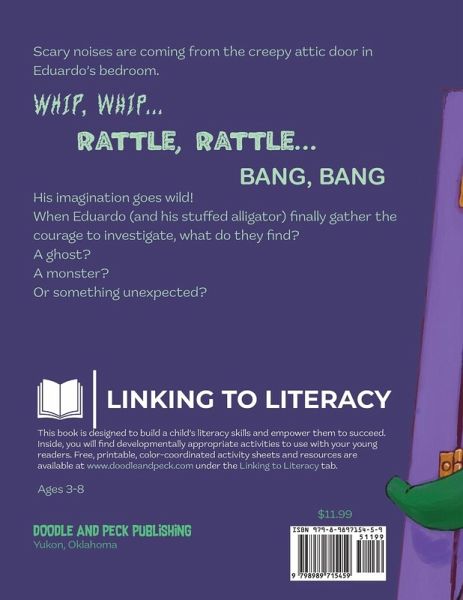Eduardo hears noises coming from behind a second, scary and creepy door in his bedroom that leads into the attic. Whip, whip! Rattle, rattle! Bang, bang! And it's not the door to his bedroom. His vivid imagination leads him to believe it might be a monster. But when Eduardo gathers up his courage to open the attic door, he's knocked backward by a gust of cold air. Eduardo squeals, slams the door closed, and hides under his covers. Eduardo's mom rushes into the bedroom and they both enter the attic to investigate. They find the attic window is open, and a broken shutter banging against the house. Eduardo tells mom he wants to move into the bedroom across the hall where there is no extra door!