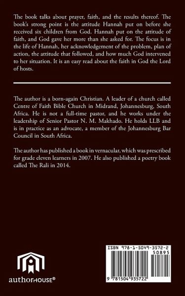 The book talks about prayer, faith, and the results thereof. The book's strong point is the attitude Hannah put on before she received six children from God. Hannah put on the attitude of faith, and God gave her more than she asked for. The focus is in the life of Hannah, her acknowledgement of the problem, plan of action, the attitude that followed, and how much God intervened to her situation. It is an easy read about the faith in God the Lord of hosts.