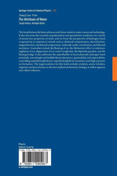 This book features the latest advances and future trends in water science and technology. It also discusses the scientific popularization and quantitative resolution of a variety of mysterious properties of water and ice from the perspective of hydrogen-bond cooperativity in response to stimuli such as chemical contamination, electrification, magnetification, mechanical compression, molecular undercoordination, and thermal excitation. Anomalies include the floating of ice, the Hofmeister effect in solutions, regelation of ice, slipperiness of ice, water's tough skin, the Mpemba paradox, and the floating bridge. It also addresses the superfluidity of microchannels, hydrogen bond potentials, nanodroplet and bubble thermodynamics, quasisolidity and supersolidity, controlling superhydrophobicity-superhydrophilicity transition, and high-pressure ice formation. The target audience for this book includes students, senior scholars, engineers and practitioners in the area of physical chemistry,biology, as well as aqueous and colloid solutions.