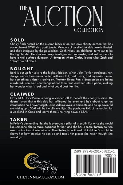 Sold Christy finds herself on the auction block at an exclusive charity auction that has some discreet BDSM club participants. Members of an elite kink club have infiltrated, and she's intrigued by the possibilities. Zach Nikas, an old flame, turns out to be the high bidder. He's hot and sexy, intelligent and successful, and just happens to have a well-outfitted dungeon. A dungeon where Christy learns what Zach and "play" are all about. Bought Roni is put up for sale to the highest bidder. When John Taylor purchases her, she gets more than she expected with one tall, dark, sexy, and mysterious man. But something sinister is going on. Women fitting Roni's description are being murdered. Roni finds out things about John that send her into a panic, making her wonder what's real and what could cost her life. Claimed Navy SEAL Rick Pierce is being auctioned off to benefit the charity auction. He doesn't know that a kink club has infiltrated the event and he's about to get an introduction he'll never forget. Leslie Adams loves to dominate and tie up powerful men--tying up a SEAL will be the ultimate high. She purchases Rick at the auction for a weekend in Cabo and learns there's no tying down a SEAL. Taken In Kelley's demanding life, she is everyone's pillar of strength. For once she would like someone else to make decisions for her, and she has a secret fantasy to turn over control to a dominant man. Then Kelley is auctioned off to Nate Davis. Nate shows her how creative he can be and takes her places she never thought she would go.