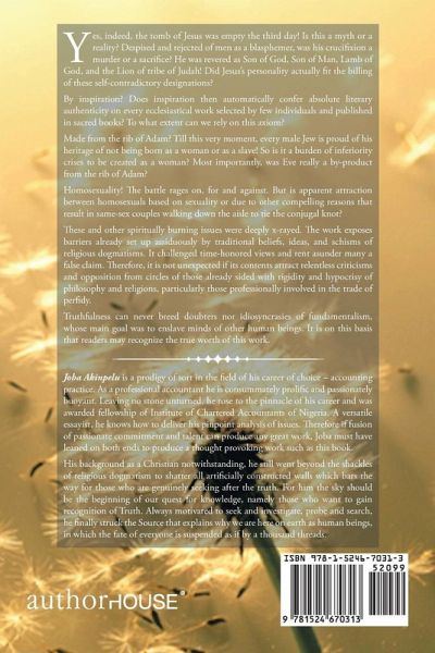 Yes, indeed, the tomb of Jesus was empty the third day! Is this a myth or a reality? Despised and rejected of men as a blasphemer, was his crucifixion a murder or a sacrifice? He was revered as Son of God, Son of Man, Lamb of God, and the Lion of tribe of Judah! Did Jesus’s personality actually fit the billing of these self-contradictory designations? By inspiration? Does inspiration then automatically confer absolute literary authenticity on every ecclesiastical work selected by few individuals and published in sacred books? To what extent can we rely on this axiom? Made from the rib of Adam? Till this very moment, every male Jew is proud of his heritage of not being born as a woman or as a slave! So is it a burden of inferiority crises to be created as a woman? Most importantly, was Eve really a by-product from the rib of Adam? Homosexuality! The battle rages on, for and against. But is apparent attraction between homosexuals based on sexuality or due to other compelling reasons that result in same-sex couples walking down the aisle to tie the conjugal knot? These and other spiritually burning issues were deeply x-rayed. The work exposes barriers already set up assiduously by traditional beliefs, ideas, and schisms of religious dogmatisms. It challenged time-honored views and rent asunder many a false claim. Therefore, it is not unexpected if its contents attract relentless criticisms and opposition from circles of those already sided with rigidity and hypocrisy of philosophy and religions, particularly those professionally involved in the trade of perfidy. Truthfulness can never breed doubters nor idiosyncrasies of fundamentalism, whose main goal was to enslave minds of other human beings. It is on this basis that readers may recognize the true worth of this work.