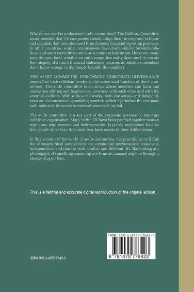 The Audit Committee: Performing Corporate Governance argues that such criticism overlooks the ceremonial function of these committees. The audit committee is an arena where members can form and strengthen shifting and fragmentary networks with each other and with the external auditors. Within these networks, both consensus and independence are demonstrated, generating comfort, which legitimises the company and maintains its access to external sources of capital.
