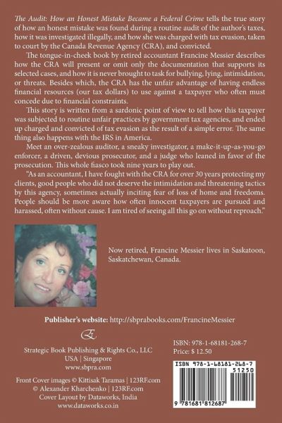 The Audit: How an Honest Mistake Became a Federal Crime tells the true story of how an honest mistake was found during a routine audit of the author’s taxes, how it was investigated illegally, and how she was charged with tax evasion, taken to court by the Canada Revenue Agency (CRA), and convicted. The tongue-in-cheek book by retired accountant Francine Messier describes how the CRA will present or omit only the documentation that supports its selected cases, and how it is never brought to task for bullying, lying, intimidation, or threats. Besides which, the CRA has the unfair advantage of having endless financial resources (our tax dollars) to use against a taxpayer who often must concede due to financial constraints. This story is written from a sardonic point of view to tell how this taxpayer was subjected to routine unfair practices by government tax agencies, and ended up charged and convicted of tax evasion as the result of a simple error. The same thing also happens with the IRS in America. Meet an over-zealous auditor, a sneaky investigator, a make-it-up-as-you-go enforcer, a driven, devious prosecutor, and a judge who leaned in favor of the prosecution. This whole fiasco took nine years to play out. "As an accountant, I have fought with the CRA for over 30 years protecting my clients, good people who did not deserve the intimidation and threatening tactics by this agency, sometimes actually inciting fear of loss of home and freedoms. People should be more aware how often innocent taxpayers are pursued and harassed, often without cause. I am tired of seeing all this go on without reproach." Now retired, Francine Messier lives in Saskatoon, Saskatchewan, Canada. Publisher’s website: http://sbprabooks.com/FrancineMessier