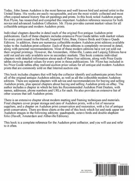 Do you know what your John James Audubon bird and mammal prints are worth? Do you even know if they are authentic or cheap reproductions? Noted Audubon expert, Ron Flynn, has researched and compiled this important reference resource for the Audubon collector. Information about each Audubon edition is given in individual chapters, along with detailed Price Guide tables with market values for every print in the following original antique Audubon editions: Havell, Bien, Imperial Folio, Octavo Birds and Octavo Quads, plus the modern Amsterdam, Abbeville, Leipzig and Loates Editions. Realized eBay auction prices are included in the Price Guides for those editions commonly sold on that Internet site. Other chapters deal with: identifying and authenticating prints, buying and selling Audubon prints, and buying and selling on eBay. Mr. Flynn provides a list of his recommended Audubon dealers. Finally, there are chapters covering: matting and framing, print storage and care, and print conservation and restoration.